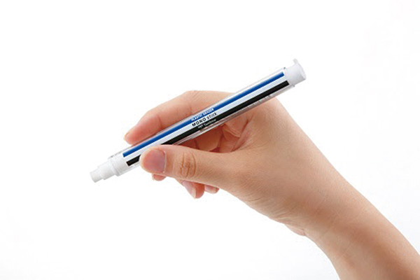 特長は、ブロック形の「モノ消しゴム」と同じプラスチック消しゴムをスティック形にして、ペンタイプのノック式ホルダーで使用する点。