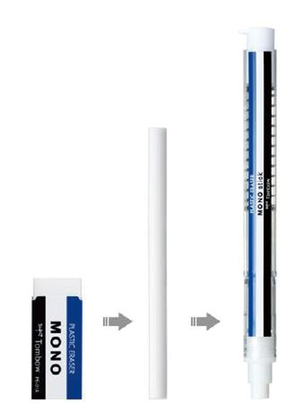 消しゴムは、広く愛用されている青白黒3色柄のブロック形「MONO(モノ)PEシリーズ」と同じプラスチック消しゴムで、字消し能力と使用感を変えずに直径6.7ミリ・長さ100ミリのスティック形にした。字消し能力は90%超(※)。プラスチック消しゴムの使用を指定しているマークシート方式の試験などの修正具としても利用可能。※字消し能力評価はJIS6050に準拠