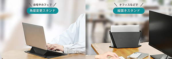 働き方の多様化でテレワークが定着したことによって、ノートPCを持ち運んで色々な場所で使用する機会が増えているが、「あったらいいな」というニーズを満たすPCケースが「オリスタ」だ。「角度変更スタンド」機能はPC使用時の操作性を改善し、「縦置きスタンド」機能は充電時などにデスクスペースの確保を可能にした。