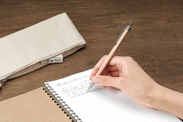 ペン先(口金)とクリップ、ノックキャップはメタル製。耐久性に優れ、永く愛着を持って使用することができる。メタル仕上げは木肌と調和させたマットな風合いにした。