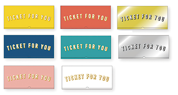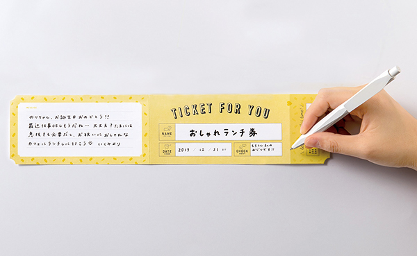 本物のチケットのように半券を切り取れるミシン目付き。また本物チケットを入れられるサイズにしたほか、メッセージ欄、有効期限日や使った日を書く欄も設けている。