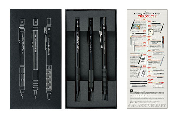 また、限定モデル3種すべてと、ぺんてるの製図用シャープペンシル60年の歴史をまとめた年表を同梱したセット(税込4,950円)も同時に発売する。