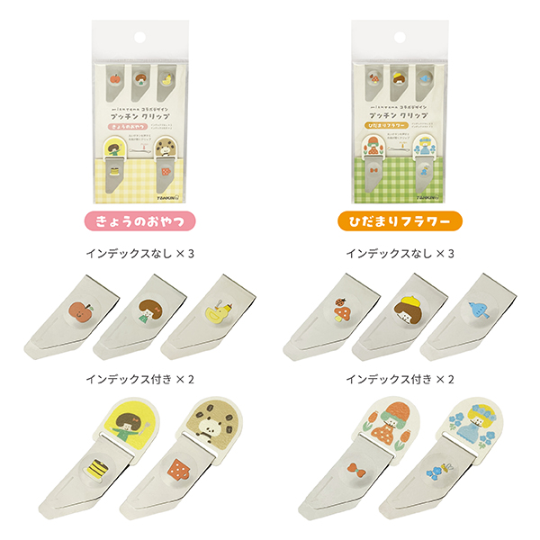 ラインナップは「きょうのおやつ」「ひだまりフラワー」の2種類。どちらも、インデックスなしタイプ3個とインデックス付きタイプ2個が入ったセットで、クリップのイラストがそれぞれ異なっている。