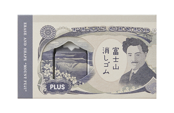 今回、プラスと東京コミュニケーションアート専門学校の共同企画から、旧千円札がモチーフの富士山消しゴムが登場した。