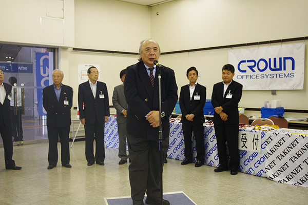 原田社長は「昨日は同じ会場でユーザーフェアもあり、活気があったと聞いている。今日のブースは、新しい商品や、官公庁・法人向け商品、個人向けのパーソナルグッズなどが目立つ。色々な機会を捉え、販売店に利益をもたらし、メーカーも業績を確保することで、私たちも存続していける。今日も丁寧で積極的な接客をお願いしたい」とあいさつした。