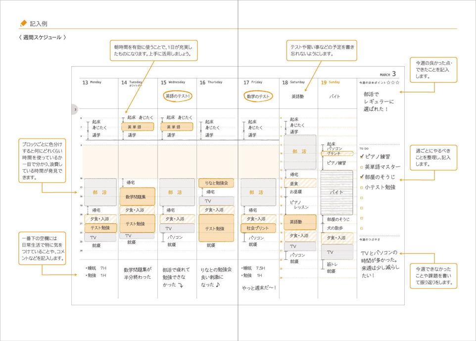 学生の頃から「計画・記録・見直し」という3ステップを習慣化することで手帳に馴染んでもらいたいという気持ちも込めた。