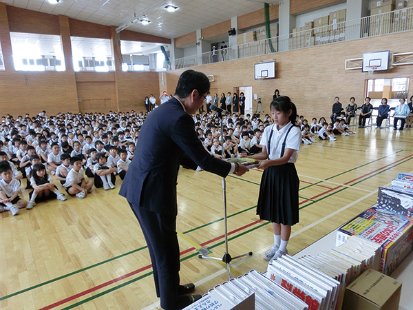 体育館に集合した全校児童を前に、はじめに中条社長が「みなさん、全国第1位おめでとう。ベルマークは、全国1万1227校から360万票集まり、その中で大島小学校が1万870票を収集してもらい、全国第1位になった。このベルマークキャンペーンは、毎年開催し、一番多く集めた学校を訪れて記念品を贈呈している。きょうは、たくさんの本を贈るので、たくさん読んで勉強してほしい。ベルマークを集めることは、手間がかかり大変な作業だが、校長先生をはじめ、学校関係者、PTA、収集の仲間のみなさんのおかげでたくさんのベルマークを収集することができた。ベルマークを集めると、学校の備品を購入できる以外に、日本では全各地で災害が数多く起こっており、被災した学校にもみなさんの善意を贈ることができる。また、富山県の学校が全国第1位になり、大変にうれしい。それは、ショウワノートの本社と工場は高岡にあり、私も高岡出身で、こんなにうれしいことはない。みなさんが使っているジャポニカ学習帳は、高岡工場ですべて製造し、全国の学校に送られている。昨年5月に高岡工場が新しくなり、楽しくおもしろく工場見学ができるようになったので、ぜひ、工場に来ていただきたい」と、あいさつした。