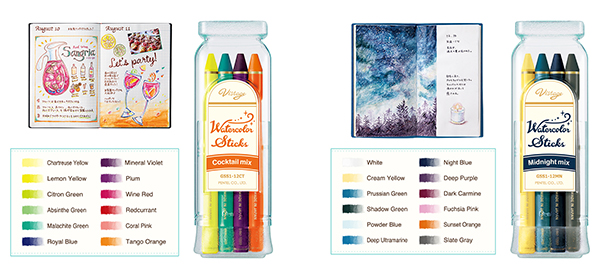 色鉛筆のように描け、みず筆を用いると淡いタッチの水彩画を楽しむことができ、色数は全部で60色。テーマごとに選んだ12色が入った5種類のセットがあり、その時の気分によって使い分けることも。この度、より深みのある新色セット「カクテルミックス」「ミッドナイトミックス」の2種類が追加された。