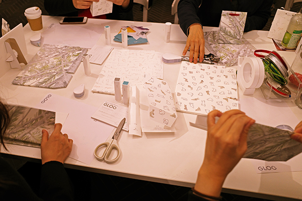 □は、コクヨGLOOの人気アイテムであるスティックのりを使い、今回のためにhakoniwaが選んだ3人のクリエイターにより特別にデザインされたオリジナルのギフトバックをつくる「貼る」体験を行った。