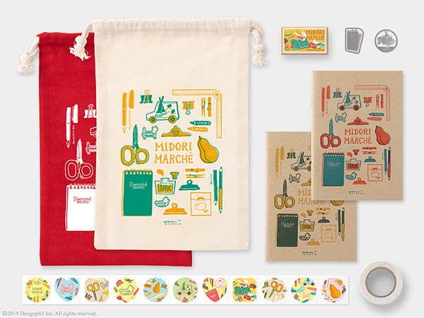 ブースのテーマは「MIDORIMARCHE(ミドリマルシェ)」。海外の蚤の市でいろいろなお店を巡り、お気に入りを見つけるように楽しむことができる。ブースでは、「動物」や「花」「食べ物」など、さまざまなテーマごとに人気アイテムが並び、また、今回の「文具女子博」の数量限定アイテムとして、「ミドリ」のアイテムが詰まった「巾着入り文具セット」が用意される。手描きタッチでパズルのように文具を散りばめた限定デザインの巾着は、好みに合わせて選べる4色展開。中には、風合いのある表紙の活版印刷が魅力の「活版印刷のノートセット」、繊細なエッチング加工で「ミドリ」の文具を表現した「エッチングクリップスミニボックス」、さまざまな柄と形が楽しめる「ロールシール」の3アイテムが入っており、どのアイテムもロングセラーアイテムをモチーフに、レトロであたたかみのあるデザインに仕上げた。