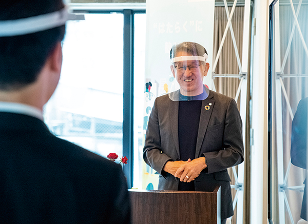 リコー(山下良則社長)は、4月1日、東京・大田区のリコー創業者市村清のゆかりの地「3L」で、3回目となる新入社員一人ひとりと社長が個別で言葉を交わす、個別入社式を行い、新入社員計79名と対面で会話する時間を設け、お祝いと感謝の気持ちを伝えた。