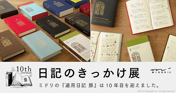 デザインフィルが展開するプロダクトブランド「ミドリ」の「連用日記扉」が発売10周年を迎えたことを記念して「日記祭」[主催:日記屋 月日/協力:散歩社、2022年12月11日、世田谷区代田、BONUSTRACK広場内]にて「日記のきっかけ展」を開催する。