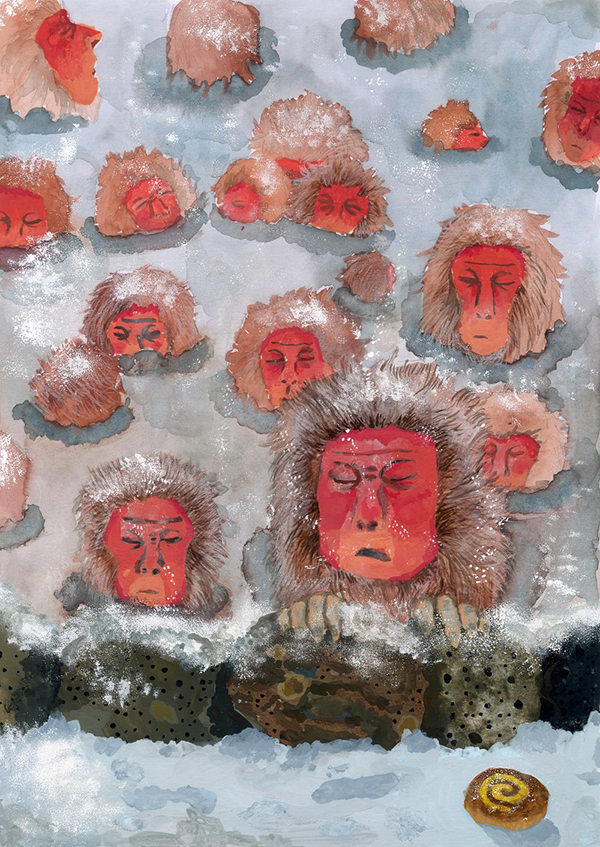 作品に込めた思い おばあちゃんの家の近くにある地獄谷野猿公苑の猿が思い出に残っているので、それを題材にしました。気持ち良さそうに温泉に浸かる猿を丁寧に描いたので、至福の表情を感じて下さい。