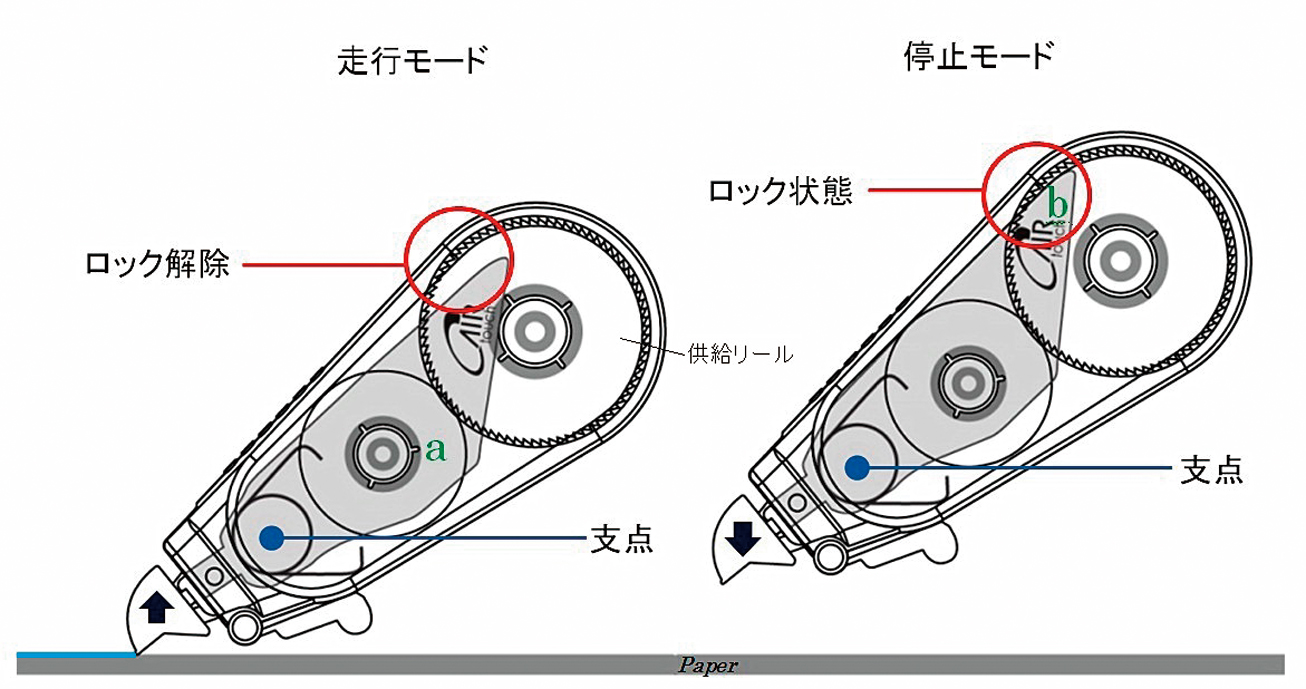 ■修正を終え修正ヘッドを紙面から離すと供給リールはロック状態に戻る。修正テープの走行が停止しているためテープがたるむことはない。