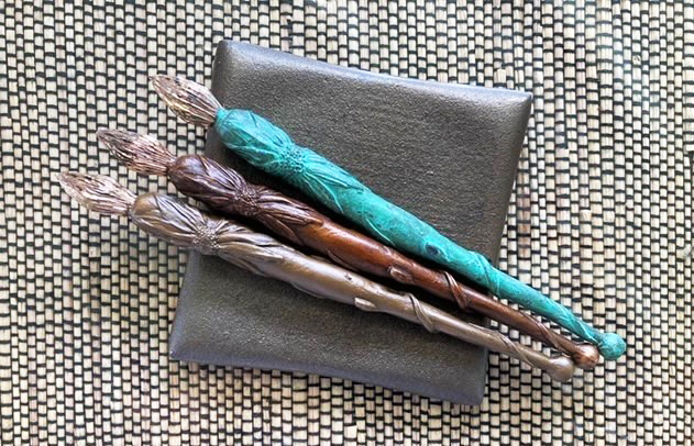 富山県高岡市の同製品メーカー秀正堂は、ひとつひとつ仕上げたブロンズ製つけペン(税抜18000円)を発売中。デザインは花鳥、コンニャ、とりの3種類。