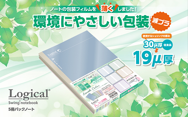 ナカバヤシは、ノートの包装フィルムを薄くして、環境にやさしい「スイング・ロジカルノートアースカラーシリーズ5冊パック」を2023年4月下旬より発売する。
