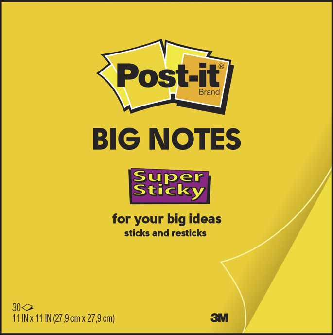 新製品の特徴は、大きな文字やイラストを書き込めるビッグサイズ。垂直面にもしっかり貼れる、強粘着タイプ。「ポスト・イット® 強粘着ビッグノート」はふせんの重ね貼りができる。