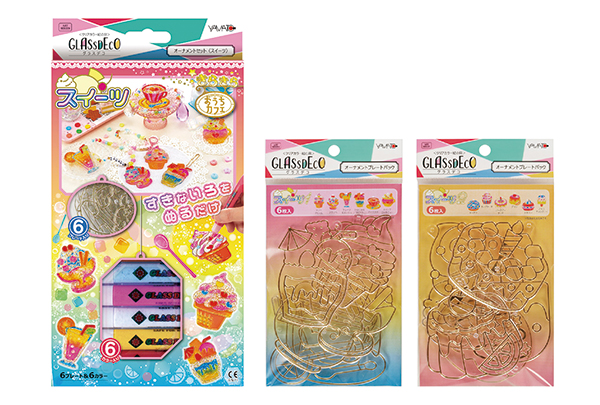 今回は人気モチーフの「スイーツ」が登場した。従来品同様、グラスデコ6カラー(本)と絵柄6コ(種)のプレートが入っており、手軽に作品が仕上がる。