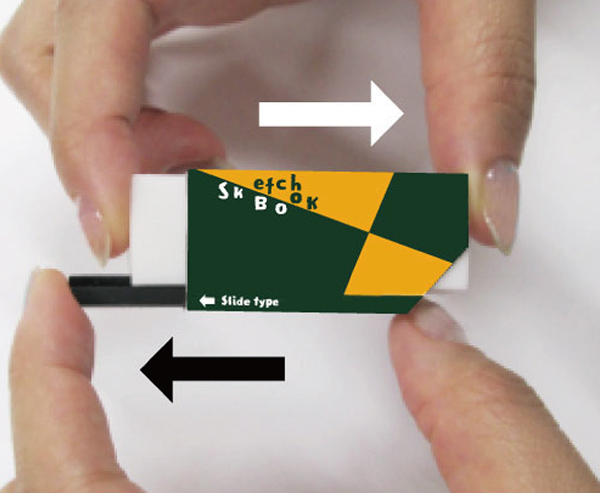 軽い力で広範囲を消せる17mm幅の「サラケシ」と硬い材質で細かい範囲を消しやすい3mm幅「硬め」が一つになった消しゴム。スライド式になっており、用途に合わせて2種類の消しゴムを押し出して使用できる。