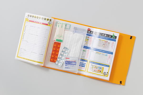 災害時に必要となる情報を記入できる3種の用紙と、収納物に合わせた3種のポケットが1つになったアイテム。