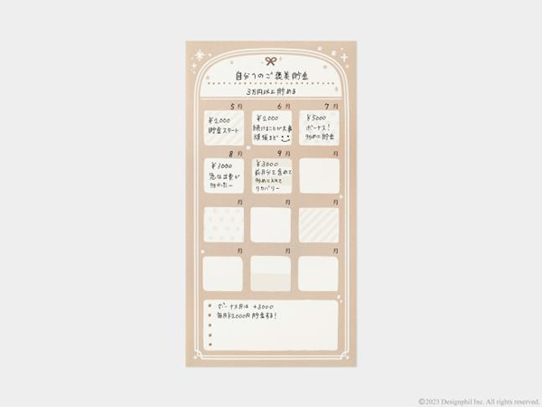 「旅行費用を貯める」「プレゼント代の3万円を貯金する」など、貯金の目的や目標金額をタイトル部分に書き込み、封筒にお金を入れたら日付やコメント、金額などを記入していく。封筒を見るだけで、どのくらい貯まったのか、あとどのくらいで目標に届くのかが把握でき、モチベーションを保ちながら貯金することができる。フォーマットは、1年間使うことができる「12ヵ月タイプ」と、日付を自由に書き込める「リストタイプ」の2種。