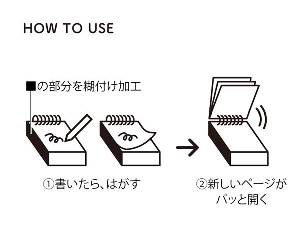 「パッとメモ」は、左側面をペーパーパッドのように糊付けし、未使用のページがすぐに開くメモ。使用済みのページはパラパラとめくれる一方、未使用のページは綴じられたままになり、次にメモを開くときに新しいページを探す必要がない。片手がふさがっているときにも便利に使え、潜在的に感じていたリングメモの不満を解決した製品。2019年の発売以降、ビジネスパーソンをはじめとした多くの人から好評を得ている。