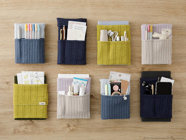 生地は、丈夫な日本製の「五泉ニット」を使用。伸縮性があり、A6~B6サイズに使用できる。手帳に取り付けて持ち運ぶ際には、本体上部のニットを折り返してポケットの上に被せることで、ポケットの中身が落ちる心配がない。