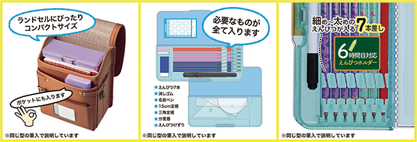 ランドセルにぴったり入る横幅に加え、厚みが3cm以下なのでランドセルのポケットや学習机の隙間にも入れやすいサイズ。コンパクトなのに学校で使う文房具を全て収納することができる。