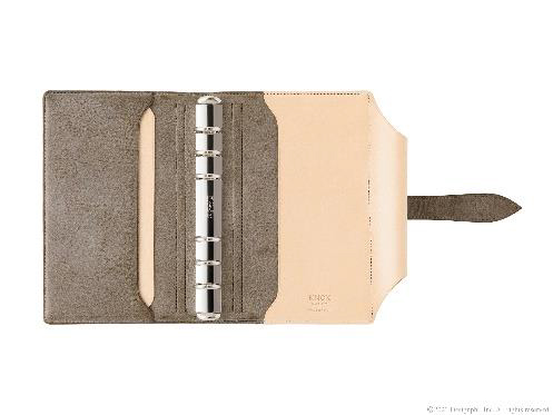 「エヌ/ピアス」は、「ピアス」のオーセンティックなデザインとコンセプトを継承しつつ、素材やつくりのモデルチェンジを行った。メインの素材には、エイジング過程でツヤと深みが増していくホワイトワックスを塗り込み、さらに型押しとは異なる自然なシボ目が現れ、ふっくら柔らかな質感に仕上げた「ホワイトワックスシュリンクレザー」を使用。内装には「ナチュラルタンレザー」を用いることで、2種類の経年変化を楽しめる。また、バイブルサイズ、ミニサイズともに20mmの太径リングを採用するなど、現代のニーズに対応した手帳スタイルを実現した。