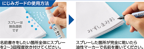 また「布用下地スプレー にじみガード」は、布や衣類のタグなど、インキがにじみやすい素材に事前にスプレーするだけで、にじまずにキレイに書けるようになる下地スプレー。