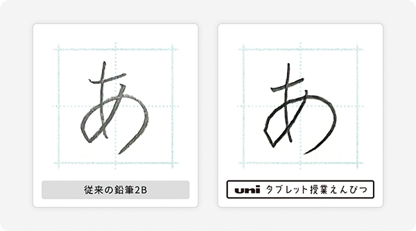 「uni タブレット授業えんぴつ」は、同じ2Bの硬度でも従来品より濃くはっきりとした文字を書くことができること、黒鉛筆芯特有の反射を抑え、明るい照明の下でも視認性が高いことが特長。