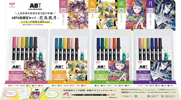 トンボ鉛筆は、水性マーカー「デュアルブラッシュペンABT」 108色の中から、人気の「和」をテーマに6色をチョイスし、これに「水筆」を加えたイラスト愛好家向けセット4種(花鳥風月)を11月20日から全国の文具店と文具コーナーで順次発売する。数量限定企画。