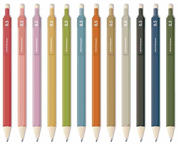 鉛筆のようなデザインのシャープペンシル。鉛筆径(7mm)に近づけた8mmの軸径を採用して握りやすさを実現。書きやすさに加え、どこか懐かしい使い心地を味わえる。定番の芯径0.5mmは全色、手帳などの細かな書き込みにも適した0.3mm、鉛筆に近い描き心地の0.9mmは2カラー(9、10)限定でラインアップしている。