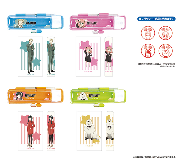 今回発売されたのはネーム印付きボールペン「スタンペンGノック式」、ネーム印の「ネームGキャップレス」と「ツインGTGKキャップレス」、「ハーフスケルトン印鑑セット」、「ハーフスケルトン印鑑ケース」、「日付印」の6種類。各商品のボディには『SPY×FAMILY』のキャラクターがデザインされている。印面にキャラクターのイラストを入れることも可能(文字数は名前または姓で2文字まで)。