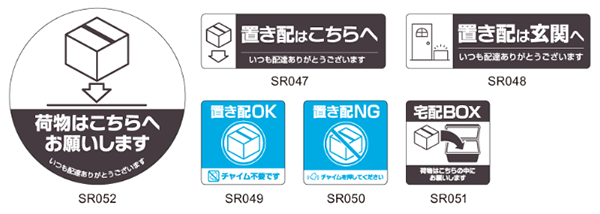 「置き配はこちらへ」「置き配OKチャイム不要」など使用現場のニーズを考えた全6アイテムのラインアップ。