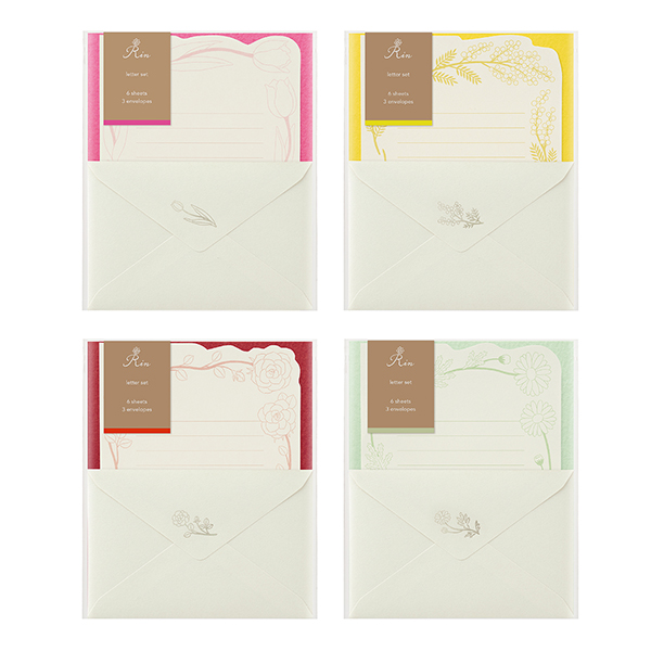 『Rinレターセット』は、一輪の花をモチーフにデザインした凛とした佇まいのレターセット。ラインアップは「チューリップ」「ミモザ」「バラ」「マーガレット」の全4種で、透け感のある紙に花の線画やワンポイントの箔を施し、シンプルかつ上品な雰囲気に仕上げた。