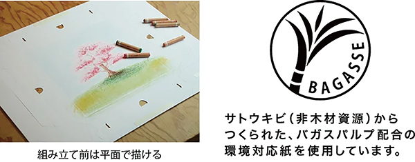 本体は、キャンバスやフレームなどすべて紙製で、立てかけに加えて壁掛け展示も安心な軽量タイプ。クレヨンや色鉛筆、マーカーや絵の具等、画材を選ばず楽しめる。