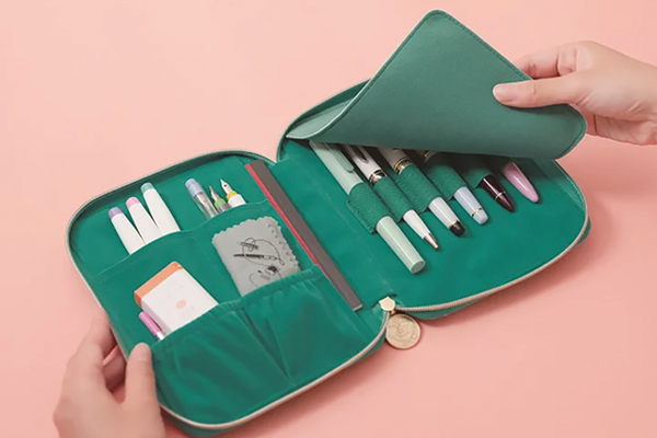 高級感のあるスエード調で、男女ともに持ちやすい、セーラー万年筆のインクでも人気の高い青緑色をチョイスした。万年筆やボールペンを美しく並べて“魅せて”収納ができ、カートリッジインクや、小さなノート、ふせんのようにこまごましたものがしっかり収納できる豊富なポケットなど、使いやすさにもこだわっている。