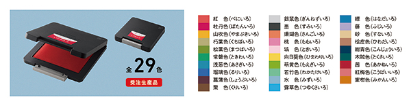 シヤチハタは、記念品スタンプやスタンプラリーなどで便利に使える大型のスタンプ台として好評の「シヤチハタ スタンプ台 タフダ」に、日本の伝統色から選定した「いろもよう」シリーズのインキを採用した「シヤチハタ スタンプ台 タフダ いろもようインキ」を8月1日から受注開始する。