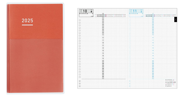 縦軸に24時間軸、横軸に前後の日付と曜日を配した独自のフォーマット「T型タイムライン」を中心に、1日1ページを使いたっぷり書き込める「DAYs」は、「通年で予定を管理したい」というユーザーの声に応え、半年ずつの分冊タイプから1年分の単冊タイプへリニューアル。