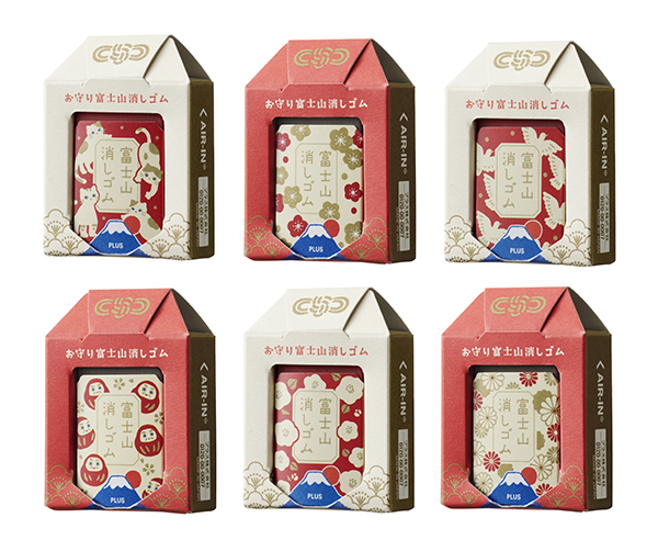 箱型のお守り型パッケージを採用した消しゴム。本体が削れることで徐々に富士山が形作られていく。多孔質セラミックスパウダーを練り込んだエアインの成分を使用しており、軽く、快適な消し心地。消しゴムケースは赤とベージュ基調のシックなデザインで、縁起の良いモチーフ(猫、梅、鳩、だるま、白椿、菊の計6種類)をラインナップ。