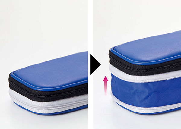 本体上下についたファスナーの開け閉めをすることで、状況に応じてフレキシブルに収納力が変えられるのが特徴のペンケース。