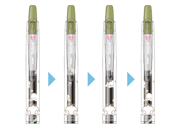 レフィルには手書き風で描かれたキャラクターと「ジュース」のペンをデザインし、それぞれのキャラクターをイメージしたインキ色を採用。こちらもノックの度にレフィルが回転するので、中のキャラクターやモチーフが動く様子を楽しむことができる。