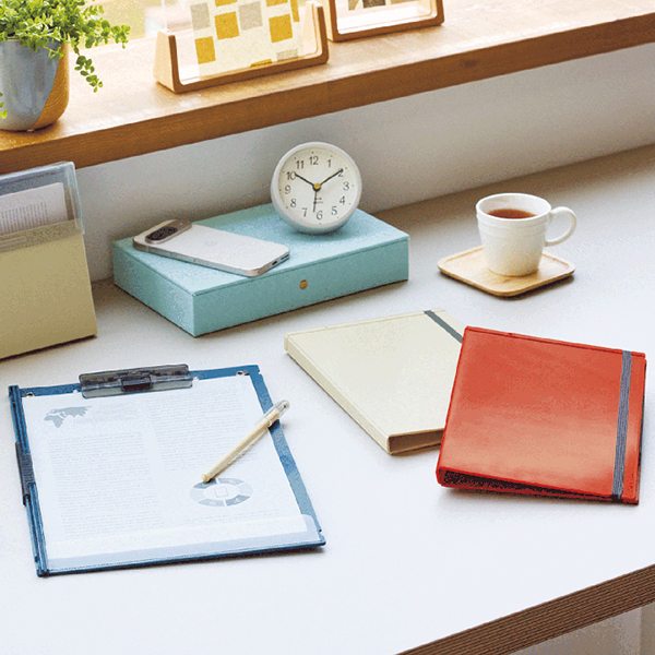 二つ折りできるクリヤーブックとクリップボードは、カバンなどにコンパクトに収納できて、外出先でもかさばらずに持ち運びができるスペパ(スペースパフォーマンス)が高い商品。