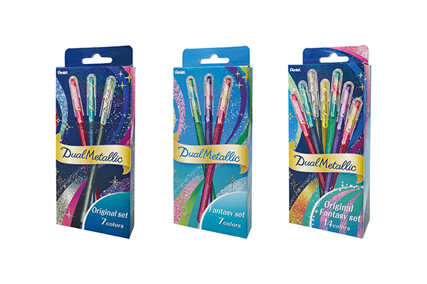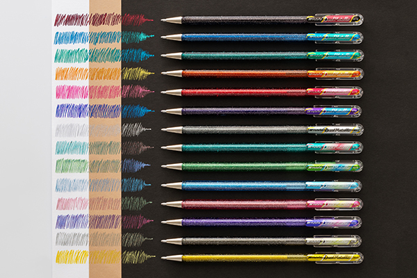 ぺんてる 角度と紙の色で見え方が変化し二重の色彩できらめく、グリッター入りボールペン「デュアルメタリック」登場
