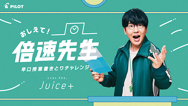 「ジュース プラス」の発売に合わせて、人気声優の花江夏樹さんを起用したプロモーション「おしえて!倍速先生 早口授業書きとりチャレンジ」を実施する。