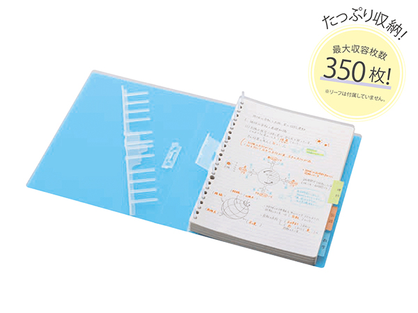 今回登場するバインダー(税込825円)は、大容量の350枚タイプで、書き終わったルーズリーフを1冊にまとめて保存することが可能。