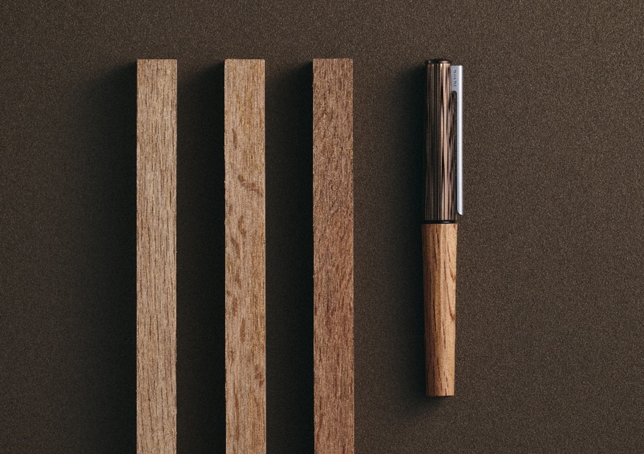 木軸モデルには、信仰の対象にもなった由緒ある木「イチイガシ」を採用。虎斑(とらふ)と呼ばれる虎の縞のような木目が特徴で、木の魅力を引き立てる。カリモク家具の高精度加工と職人の手仕事による不規則な切削痕で、工芸品のような質感を表現。キャップには樹皮を思わせる細い溝を刻み、自然の美しさを表現している。初期リフィルはファインライター。