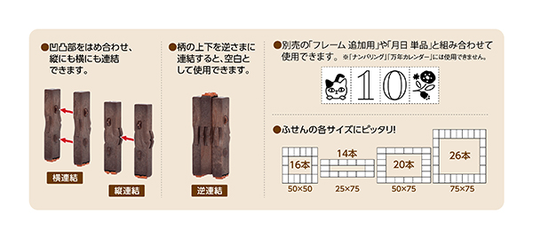 今回、デコレーションに負けずしっかりと日付表示できる大きな数字の「月日」と、連結する本数次第で好きなサイズ・形に変えられるイラスト枠・罫線の「フレーム」が登場した。
