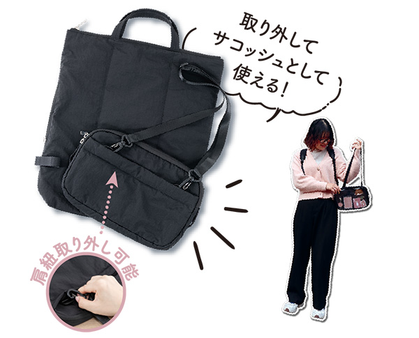 まえポケットは取り外しでき、サコッシュとして使用可能(サコッシュ用の肩紐も取り外し可)。ライブやイベント会場など、出し入れの多いシーンにも活用できる。